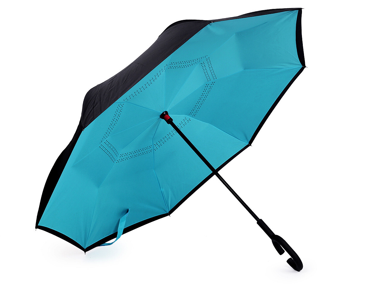 Obrácený deštník s unikátním mechanismem otevírání směrem vzhůru přináší praktické řešení, díky kterému již nebudete mít mokré kabelky, tašky nebo sedačky vašeho auta. Tento dvouvrstvý deštník s perforovaným vnitřním potahem je ideální společník do deštivých dnů.