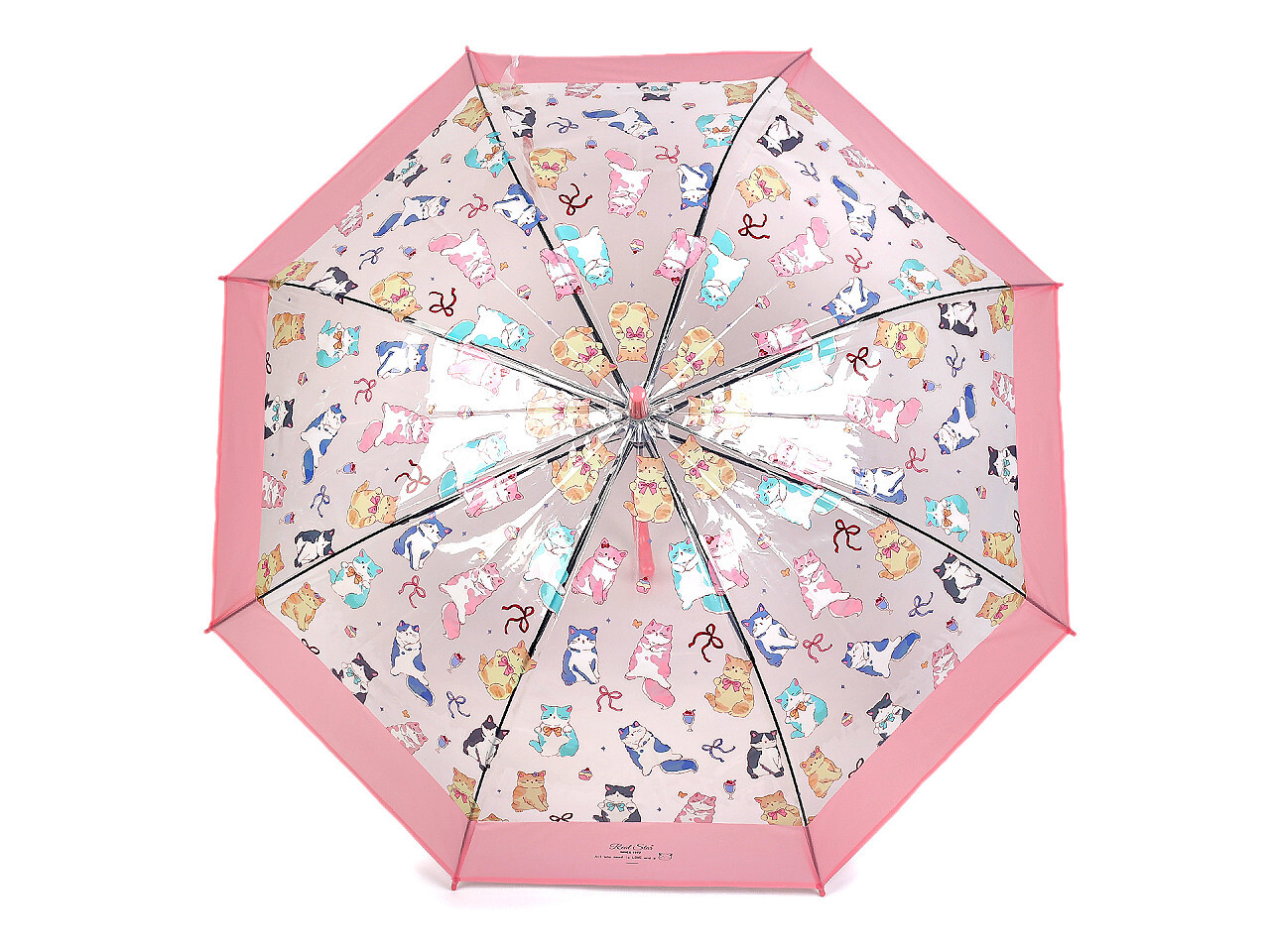 Průhledný deštník s barevným potiskem koček je ideální volbou pro všechny milovnice hravých módních doplňků. Je vystřelovací, okraj má ozdobený širokým barevným lemem. Konstrukce deštníku je z kovového drátu a pružných lamel, tvoří osm polí. Díky nim je velice pevný, neohne se ani za největšího nečasu. Klasická tyč je zakončená pevnou rukojetí.