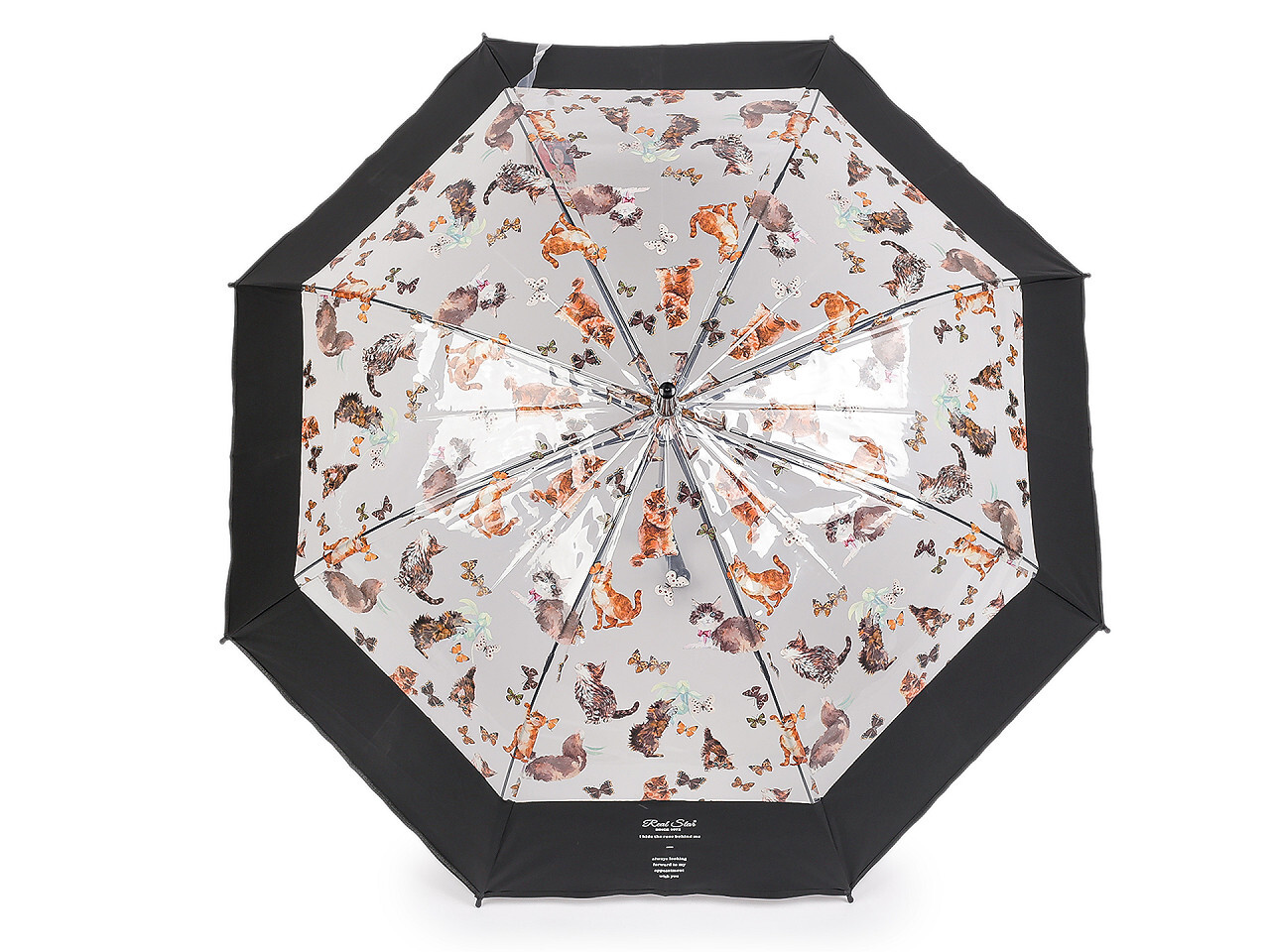 Průhledný deštník s barevným potiskem koček s motýly je ideální volbou pro všechny milovnice hravých módních doplňků. Je vystřelovací, okraj má ozdobený širokým barevným lemem. Konstrukce deštníku je z kovového drátu a pružných lamel, tvoří osm polí. Díky nim je velice pevný, neohne se ani za největšího nečasu. Klasická tyč je zakončená pevnou rukojetí.