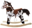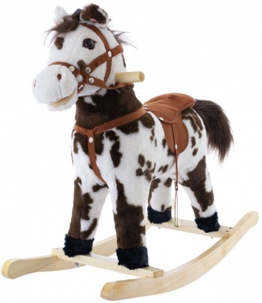 Houpací kůň. Hračka je vyrobena z materiálu velmi příjemného na dotek. Kůň má pohodlné sedlo se třmeny a otěžemi a dřevěnými rukojeťmi. Po stisknutí ucha hračka vydává různé zvuky a pohybuje ocasem a tlamou.