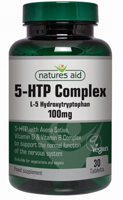5-HTP (hydroxytryptofan) Complex od britské společnosti Natures Aid, obsahuje přírodní zdroj Hydroxytryptofanu 5-HTP ze semen Griffonia Simplicifolia. Hořčík a vitamíny B3, B5 a B6, pro normální fungování nervového systému a psychologických funkcí v organizmu.