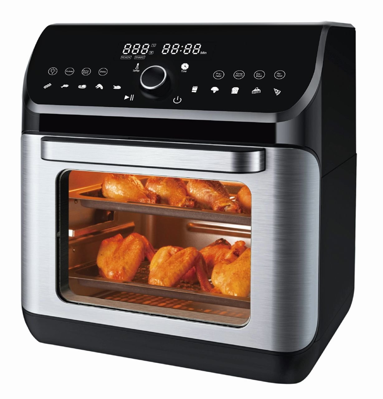 Horkovzdušná fritéza Guzzanti 3 v 1 (horkovzdušná fritéza, pečící trouba a sušička potravin) bez oleje a tuku využívá ke smažení místo oleje horký vzduch.