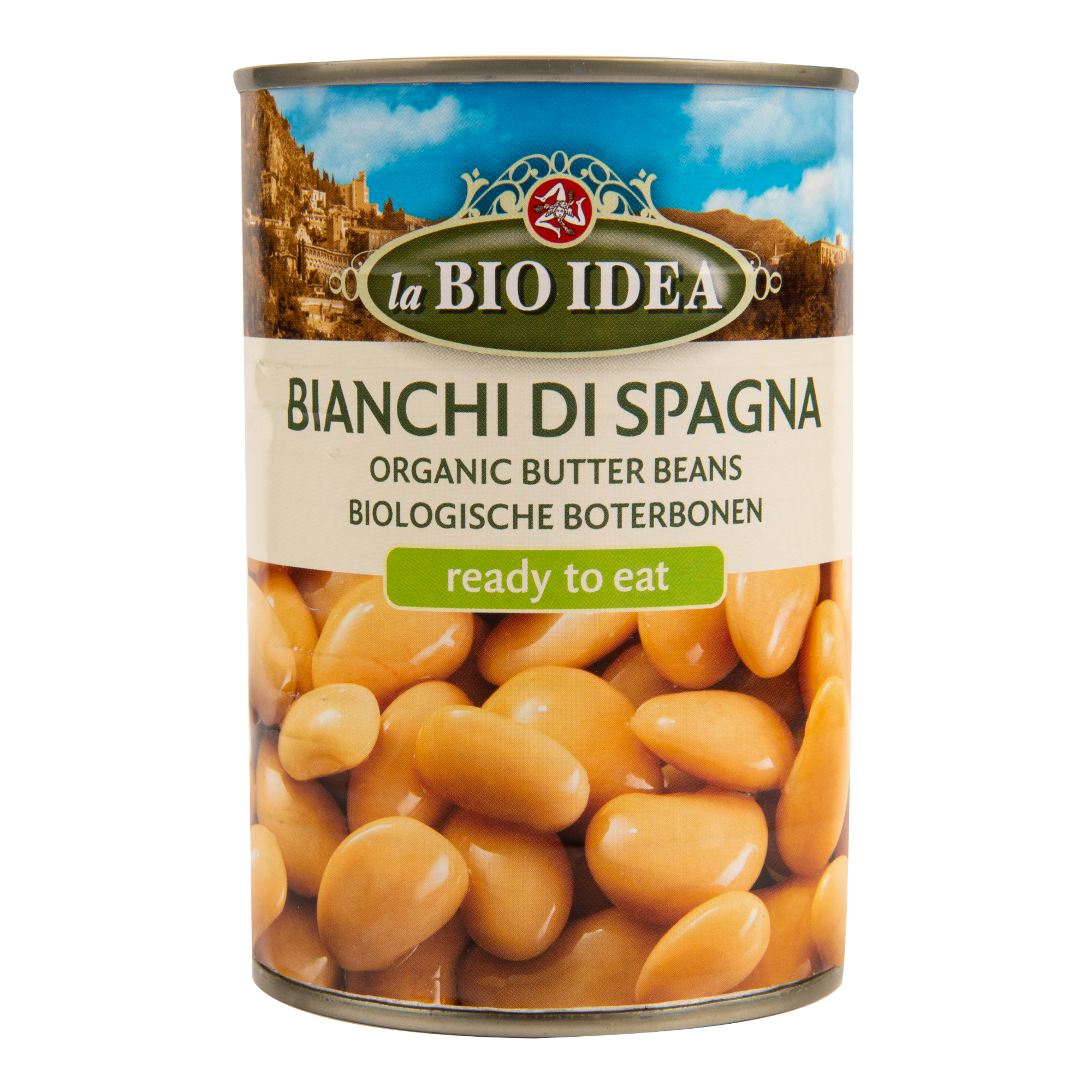 Máslové fazole 60 %, voda, jedlá mořská sůl. produkt kontrolovaného ekologického zemědělství. Hmotnost pevného podílu: 240 g.K přímé spotřebě.