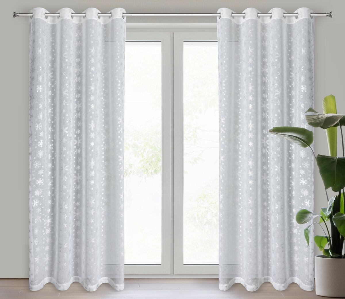 Kvalitní vánoční hotová dekorační záclona v trendovém provedení do obývacího pokoje v rozměru 140x250 cm. 1 kus v balení. Je potištěna stříbrnými vločkami. ZÁCLONA MÁ REŽNÝ VZHLED.