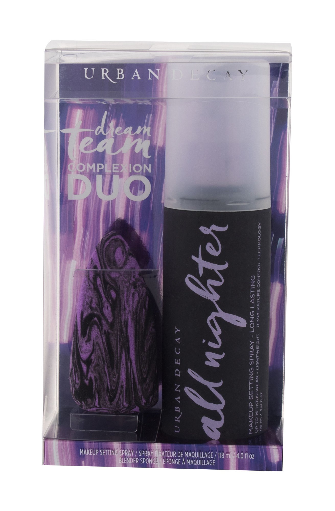 Urban Decay Dream Team Complexion Duo fixační sprej na make-up All Nighter Makeup Setting Spray 118 ml + houbička na make-up
