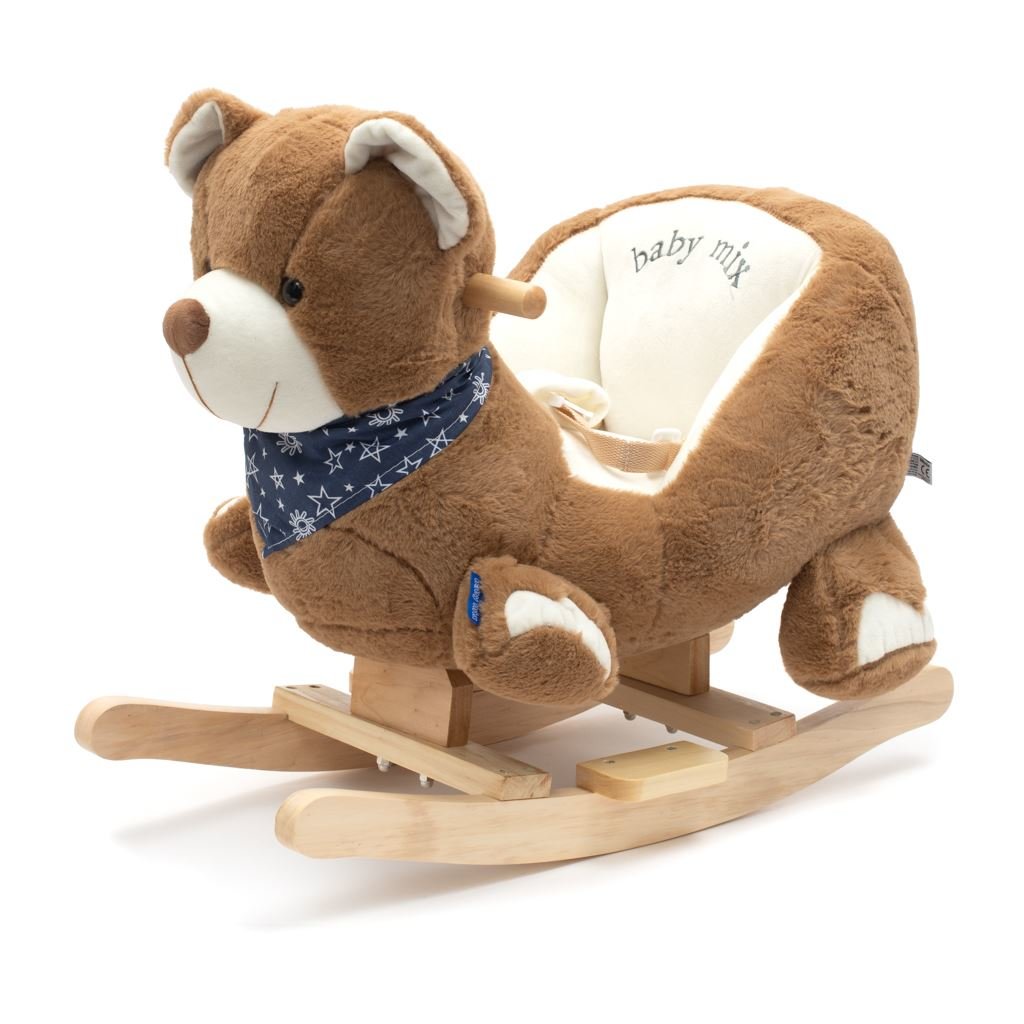 Houpací medvídek byl navržen pro děti milující dobrodružství. Pohodlné sedlo, dřevěné rukojeti a houpací lišty poskytují pohodlí a bezpečnost při bezstarostném houpání dítěte. Medvídek je ozdoben krásným šátkem. Když stisknete ouško, medvídek začne zpívat písničku. Během houpání dítě stimuluje koordinaci pohybů a rozvíjí držení rovnováhy. Kapsa s hudebním modulem a bateriemi je ukryta pod bříškem. Baterie LR44 jsou součástí dodávky. Je vyroben z měkkého plyšového materiálu, pevné dřevěné lišty nebo rukojeti lze snadno odšroubovat