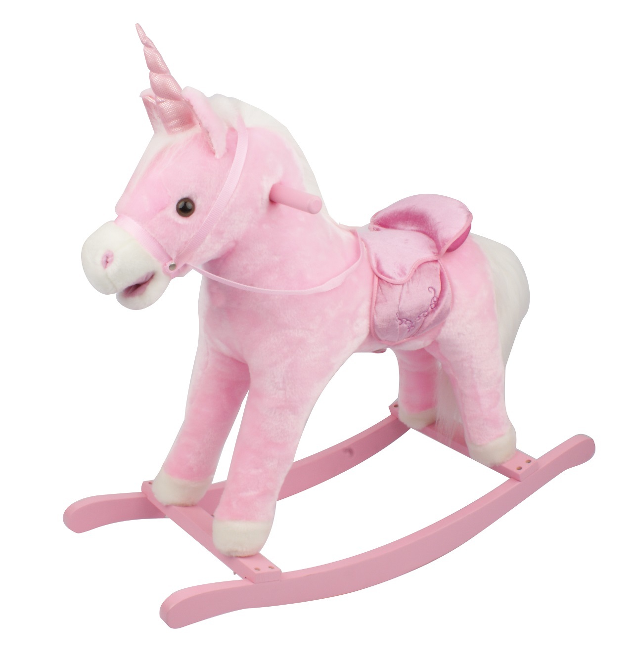 Růžový houpací jednorožek, který vydává zvuk při stlačení jednoho nebo druhého ouška. Jednorožec řehtá a kluše. Je vyroben z kvalitní a hebké plyše. Nosnost 30 kg.