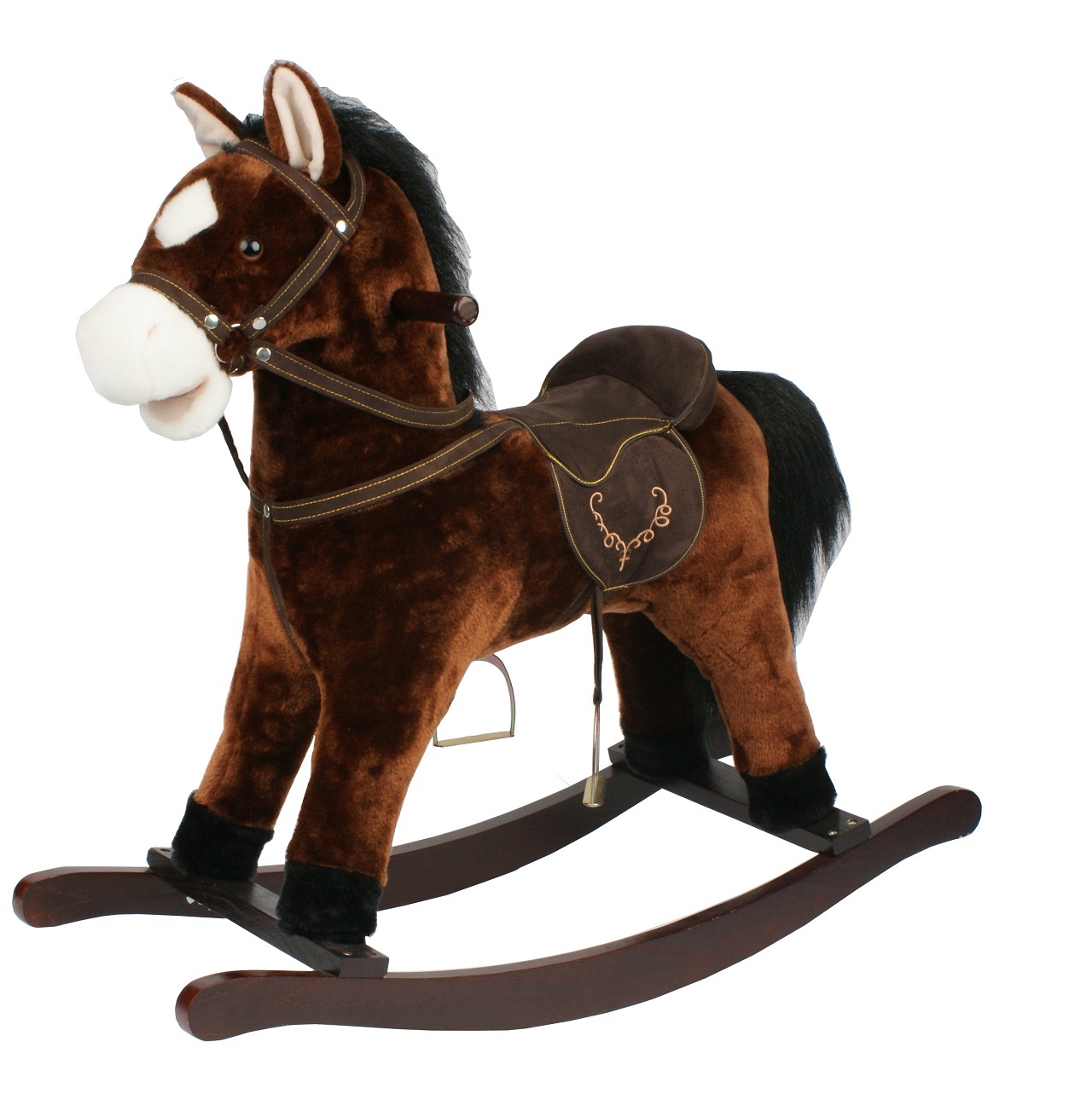 Tmavě hnědý houpací koník, který vydává zvuky při stlačení jednoho nebo druhého ouška. Řehtá a kluše. Koník hýbe pusou. Je vyroben z kvalitní a hebké plyše. Nosnost 30 kg.
