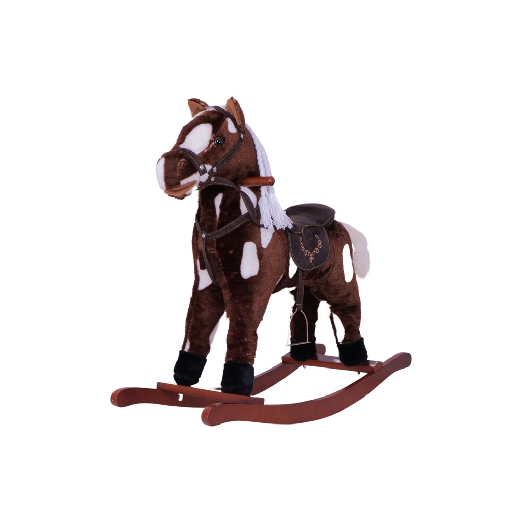 Houpací koník je vyroben z příjemného plyšového materiálu v barvě jako na obrázku. Houpací kůň má krásné sedlo včetně třmenových řemenů a třmeny. Díky kterým bude vaše dítě držet správnou polohu těla. A to není všechno! Koník hraje příjemnou dětskou melodii. Aby se koník ještě více líbil, má pletené copánky, které potěší. Technické údaje: Vyplněno plyšovou látkouDřevěný rám Nosnost: 20kgPásy:NeCertifikace: EN71Rozměry: 68x30x72 cm (DxŠxV)Výška sedáku: 47 cmDemontovatelné pro přepravu, snadná montážBarva: tmavě hnědáHmotnost: 3620 gBalení obsahuje: Houpací kůňMontážní materiál včetně nářadíNávod Ke zprovoznění modelu budete potřebovat 3x 1,5V AA baterie. Vhodné pro děti od 3 let !