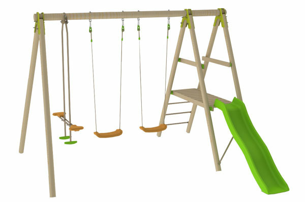 „TUTTI - celoDŘEVĚNÉ sestavy 230 cm vysoké, materiál harmonizuje se okolní zahradou.Nastavitelná výška plastového sedátka, vyrobené vstřikovací metodou Houpací kluzák s plastovými sedáky a trnoží-držák na nohy, skluzavka s nástupní plošinou Houpačka zavěšena na pevném závěsném oku. Spoje jsou...