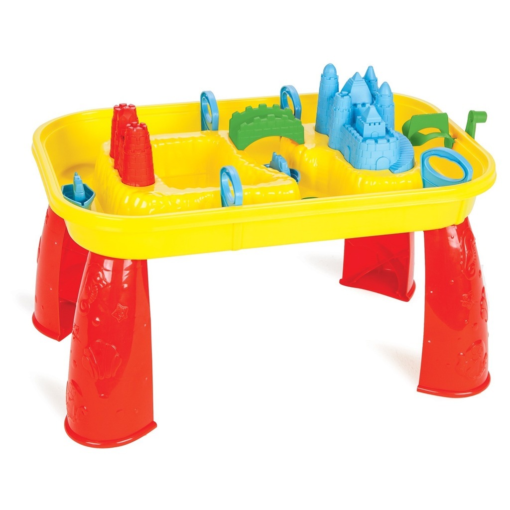 Plastový stoleček s doplňky po napuštění vodou možno brázdit lodičkami. Na dně je výpusť vody. Doplňky-bábovky jsou využitelné i na písek. Rozměry stolku 38×58 cm a výška 38 cm.