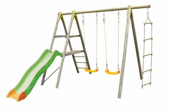 230cm široká sestava-2 sedátka+1 pro­vazový žebřík+klouzačka s nástupní plošinkou, kombinace kovové vrchní tyče s dřevěnými stojnami - lepší integrace do venkovní zahrady číst celé