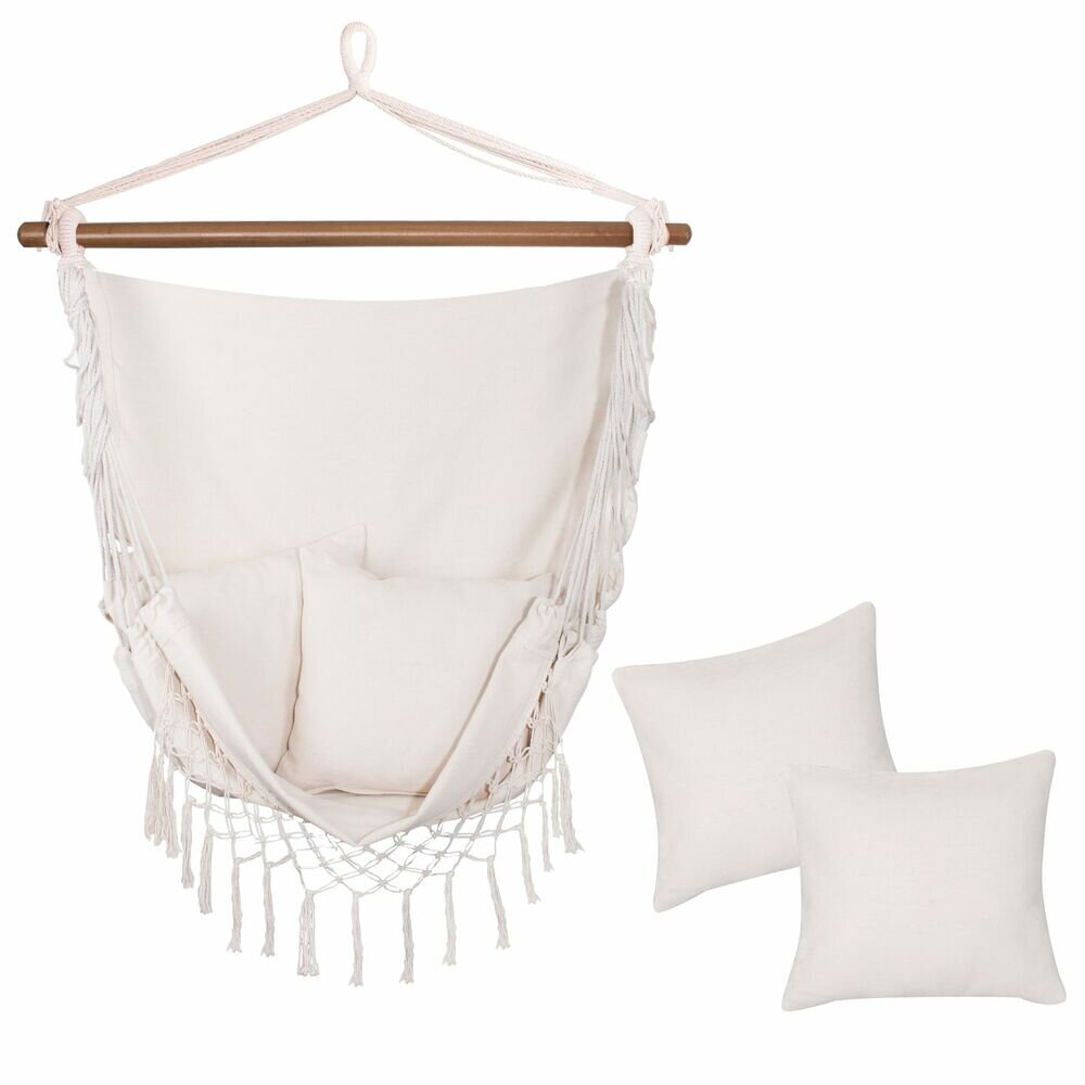 Houpací křeslo SPRINGOS BORGO II vám přináší jedinečnou kombinaci pohodlí a stylu. Jeho široký a odolný materiál z bavlněného plátna zajišťuje maximální prodyšnost, takže relaxace v něm je příjemná i během teplých dnů. Praktické závěsné poutka umožňují snadné zavěšení a přemístění křesla, zatímco pohodlné područky a měkké polštáře dodávají ještě větší komfort. Design s třásněmi ve stylu boho navíc vnese do vašeho prostoru originální a útulnou atmosféru.