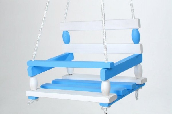 Krásná dřevěná houpačka v bílo modré barvě. Vhodná pro použití doma i na zahradě. Houpačka je bezpečná a stabilní. Rozměr sedáku 38x30cm. Nosnost houpačky 80kg. Vhodné od 3 let.