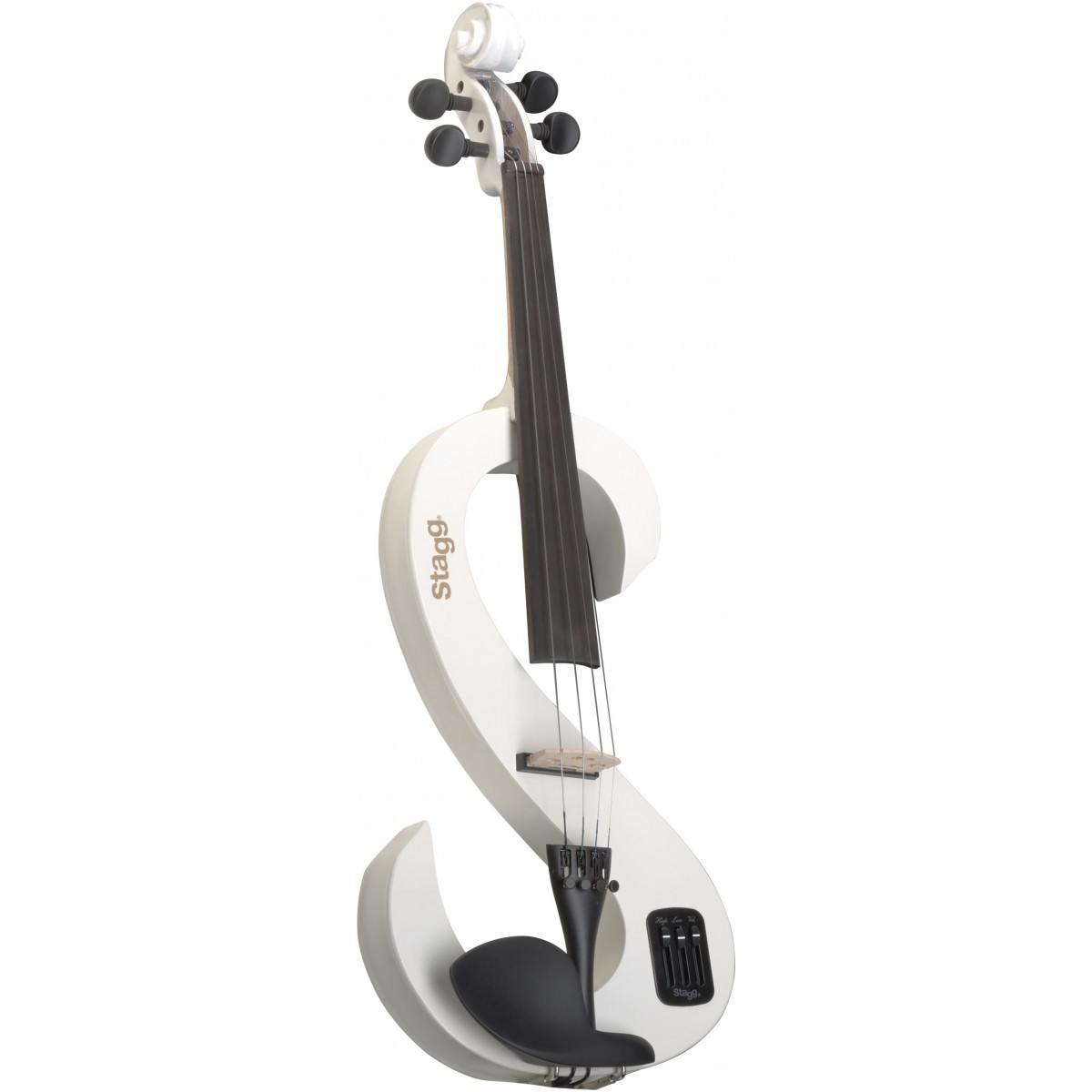 4/4 elektrické housle. Tělo masiv javor, menzura 325 mm, celková délka 590 mm, krk javor, hmatník mořené dřevo, kobylka javor, struník černý plast se čtyřmi dolaďovači, podpěra brady a ladící kolíčky černý plast. Aktivní elektronika, 3-pásmový ekvalizér s ovládáním hlasitosti, basů a výšek, vstup mini jack 3,5 mm pro CD nebo MP3 přehrávač, sluchátkový výstup mini jack 3,5 mm, výstup Jack 6,35 mm. Dodáváno vč. vyztuženého nylonového pouzdra, smyčce, kalafuny, sluchátek a 9V baterie. Barva bílá.