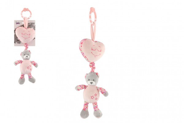 Medvěd se srdíčkem plyš závěs na postýlku/kočárek nat. hrací strojek 34cm růžový na kartě v sáčku 0+