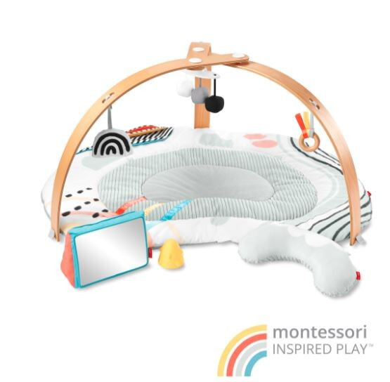 Zaprojektowana we współpracy z ekspertami w dziedzinie edukacji Montessori, nasza sala Discoverosity Play Gym oferuje równowagę pomiędzy uspokajającą prostotą i angażującym środowiskiem sensorycznym, aby pielęgnować naturalną ciekawość i rozwój dziecka od wzroku i koncentracji po umiejętności motoryczne i nie tylko. Pięć inspirowanych naturą zabawek rozwojowych, wykonanych z drewnianych łuków pochodzących ze zrównoważonych źródeł i pluszowej, sensorycznej maty do zabawy, zawiera kontrastujące wzory, szeleszczące dźwięki, dziecięce lusterko i wiele innych elementów, które zachęcają do samodzielnej aktywności i eksploracji. Sześć kart dla rodziców poprowadzi Cię przez najważniejsze etapy zabawy na siłowni, dzięki czemu Ty i dziecko będziecie mogli wspólnie odkrywać, uczyć się i rozwijać.