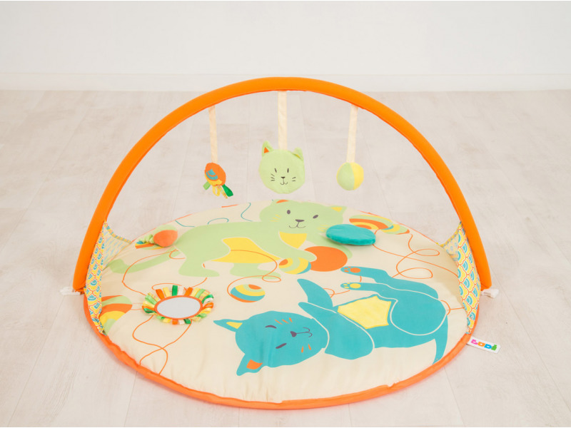 Hrací deka s krásnými motivy kočiček nabízí inovativní způsob skládání i rozkládání. Jedním pohybem deku i s hrazdou složíte do plochého tvaru a vložíte do přenosné tašky na zip, která je součástí výrobku. Stejně jednoduše deku s hrazdou zase rozložíte. Deka je tak ideální i na cesty, protože ji snadno přibalíte do cestovního zavazadla. Deka nabízí různorodé aktivity pro stimulaci smyslů dítěte - na hrazdě je zavěšený cinkající míček, šusticí kočička a kočičí packa se stužkami, přímo na dece najdete bezpečné zrcátko, vibrující míček a šusticí části. Měkká výplň a příjemná tkanina na povrchu jsou zárukou pohodlí dítěte.