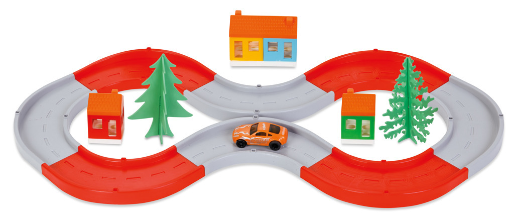 Silnice-autodráha menší o rozměrech 61 × 31 cm. Součástí balení autíčko na baterii, 3 domečky, stromky. číst celé