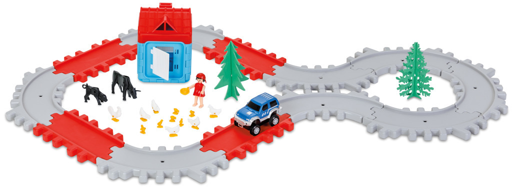 Silnice-autodráha se zvířátky a domečkem. Součástí balení autíčko na baterii. Rozměry sestavené autodráhy jsou 98 cm dlouhá a 61 cm široká. číst celé