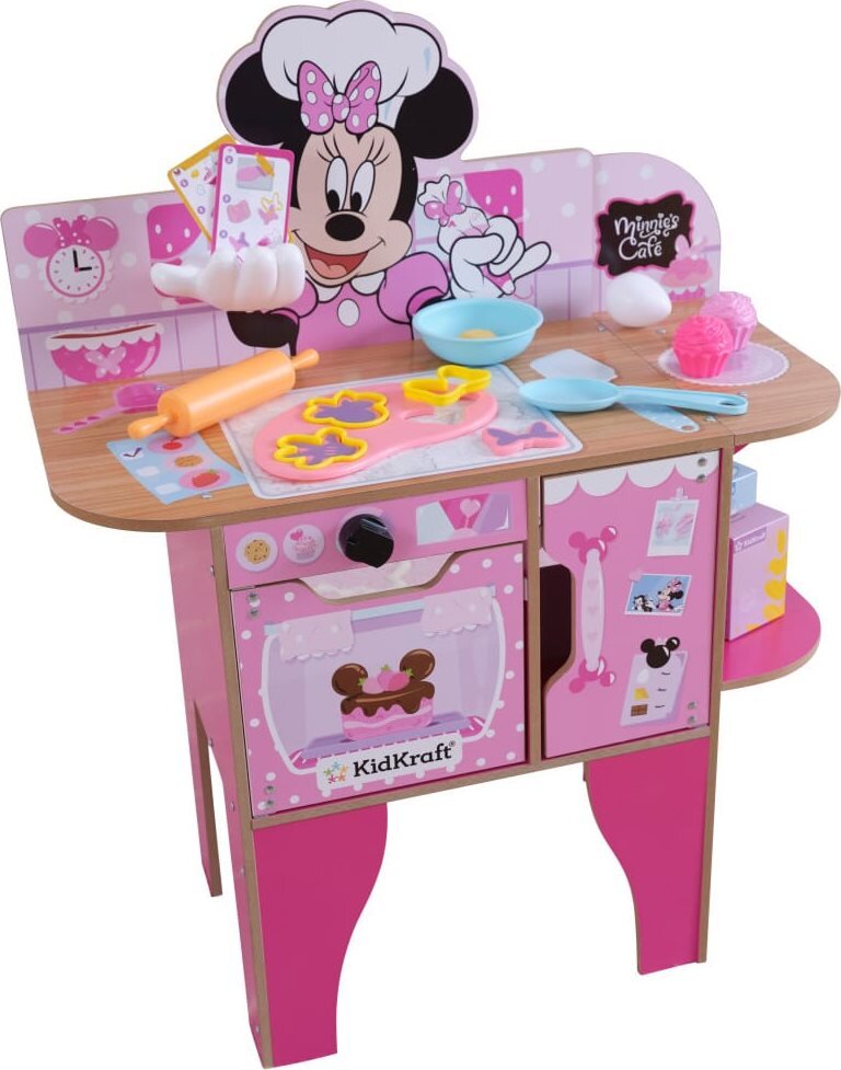 Myška Minnie je připravena podat pomocnou ruku a připravit nějaké sladké dobroty v této růžové hrací kuchyňce od KidKraft. Minnie Mouse kuchyňka umožňuje kuchařům vyzkoušet si pečení, válení těsta, vykrajování sušenek a vaření v troubě. Ruka myšky Minnie v bílé rukavici slouží jako polička na kartičku s receptem. Díky otočným knoflíkům a spotřebičům, které se otevírají a velkému pracovnímu prostoru, si děti užijí spoustu zábavy.