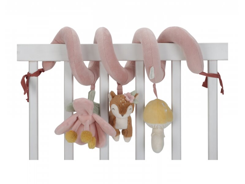 Tato textilní spirála je vybavena třemi měkkými hračkami - srnkou, květinou a houbičkou - vyrobenými z jemného plyše. Hračky chrastí, šustí a nabízejí různé textury, které stimulují zkoumání a rozvíjí koordinaci ruka - oko vašeho miminka. Díky praktickému designu ji snadno připevníte omotáním spirály kolem bočnice postýlky, madla autosedačky nebo kočárku, proto ji můžete mít stále po ruce a zabavit tak dítě na procházce i doma.