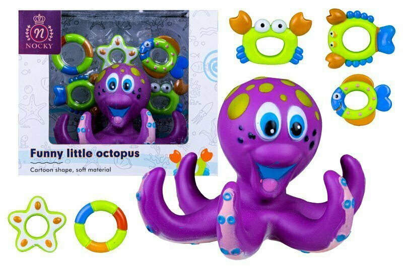Wesoła, gumowa ośmiornica z akcesoriami do kąpieli. Zestaw przeznaczony dla najmłodszych. Zabawka posiada 6 odnóżu na które można zaczepić małe zabaweczki z dziurką.W zestawie: -1x ośmiornica,-6x zawieszek z dziurką,Wymiary opakowania: 16x23x19cm.Wiek: 0m+. číst celé