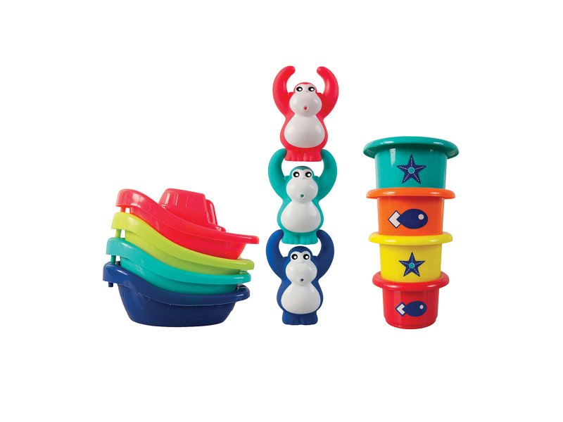 Sada hraček do koupele s rošťáckými opičkami nabízí nepřeberné možnosti hraní s vodou ve vaně. Čtyři lodičky plují po hladině samostatně nebo propojené za sebou, stejně tak tři opičky mohou ve vodě dovádět každá zvlášť nebo spojené dohromady. Čtyři kelímky s otvory pro cezení vody je možné skládat do sebe i stavět z nich věž.