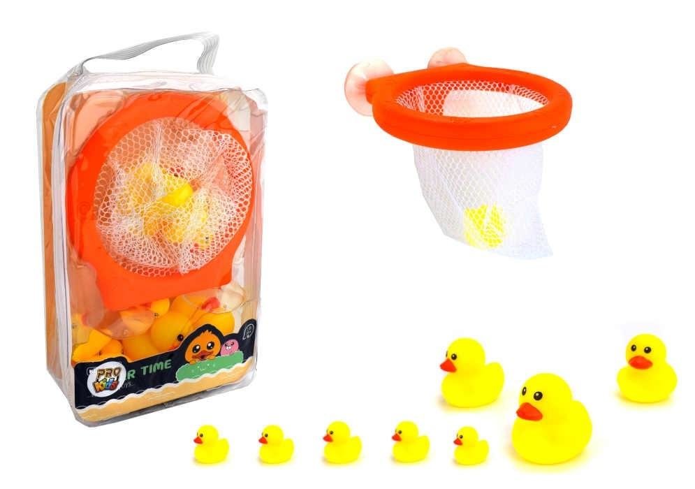 Kaczka do łowienia zachęci dziecko do kąpieli. W zestawie są 3 duże kaczki i 6 małych. Zabawa polega na wyławianiu kaczuszek siatką z wody.