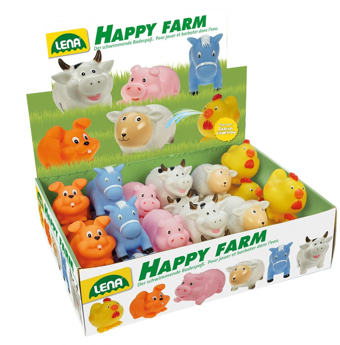 Zwierzęta do kąpieli LENA Happy Farm, 6 różnych. Gdy tylko zwierzęta zostaną zanurzone w wodzie, po naciśnięciu emitują strumień wody. Wysokość figurek: 5-7 cm. Odpowiednie dla najmłodszych od 12 miesięcy.