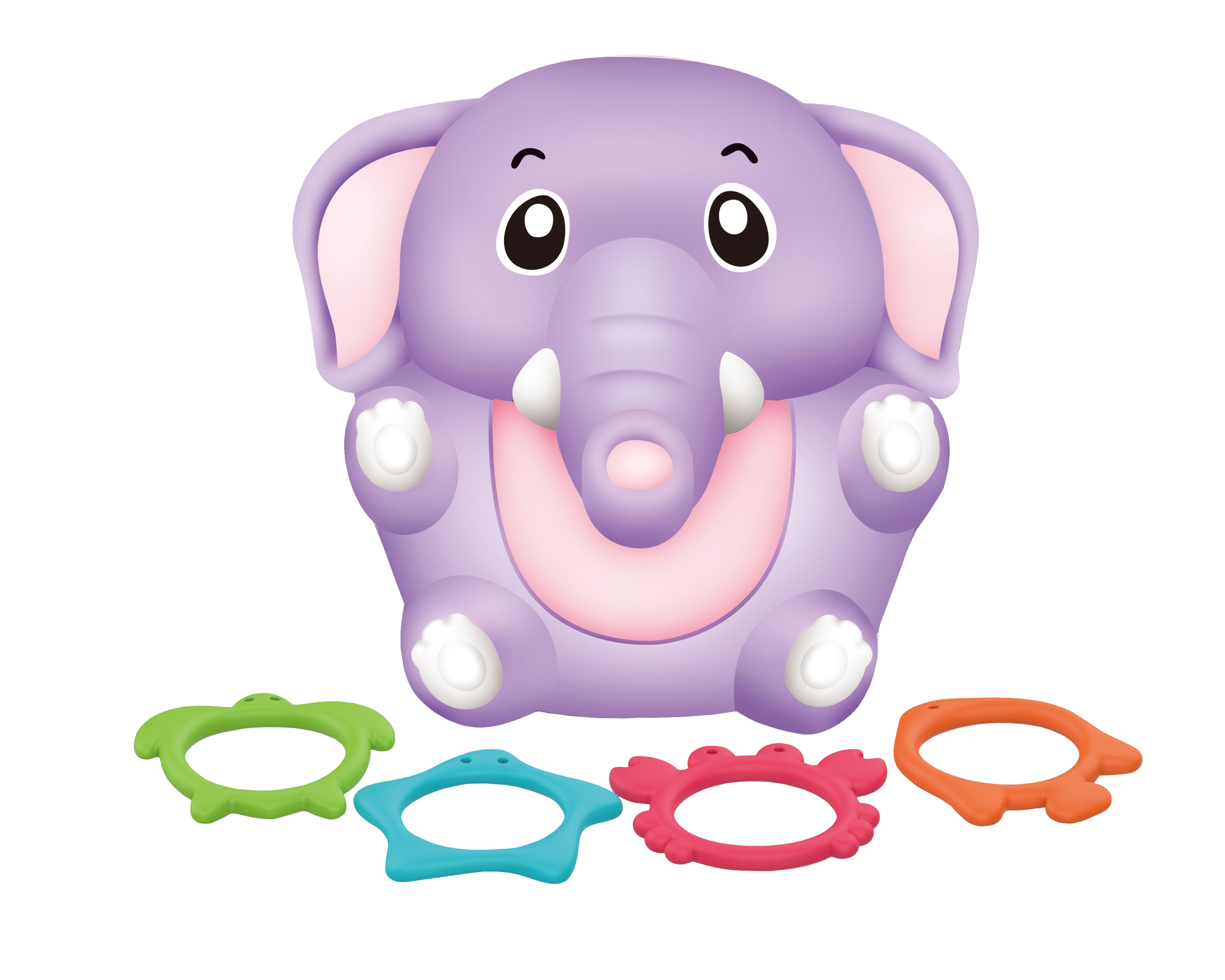 Slon s kroužky do vany. Rozměry 13x10x11 cm. Součástí plovoucí slon a 4 kroužky pro házení na chobot slona. číst celé