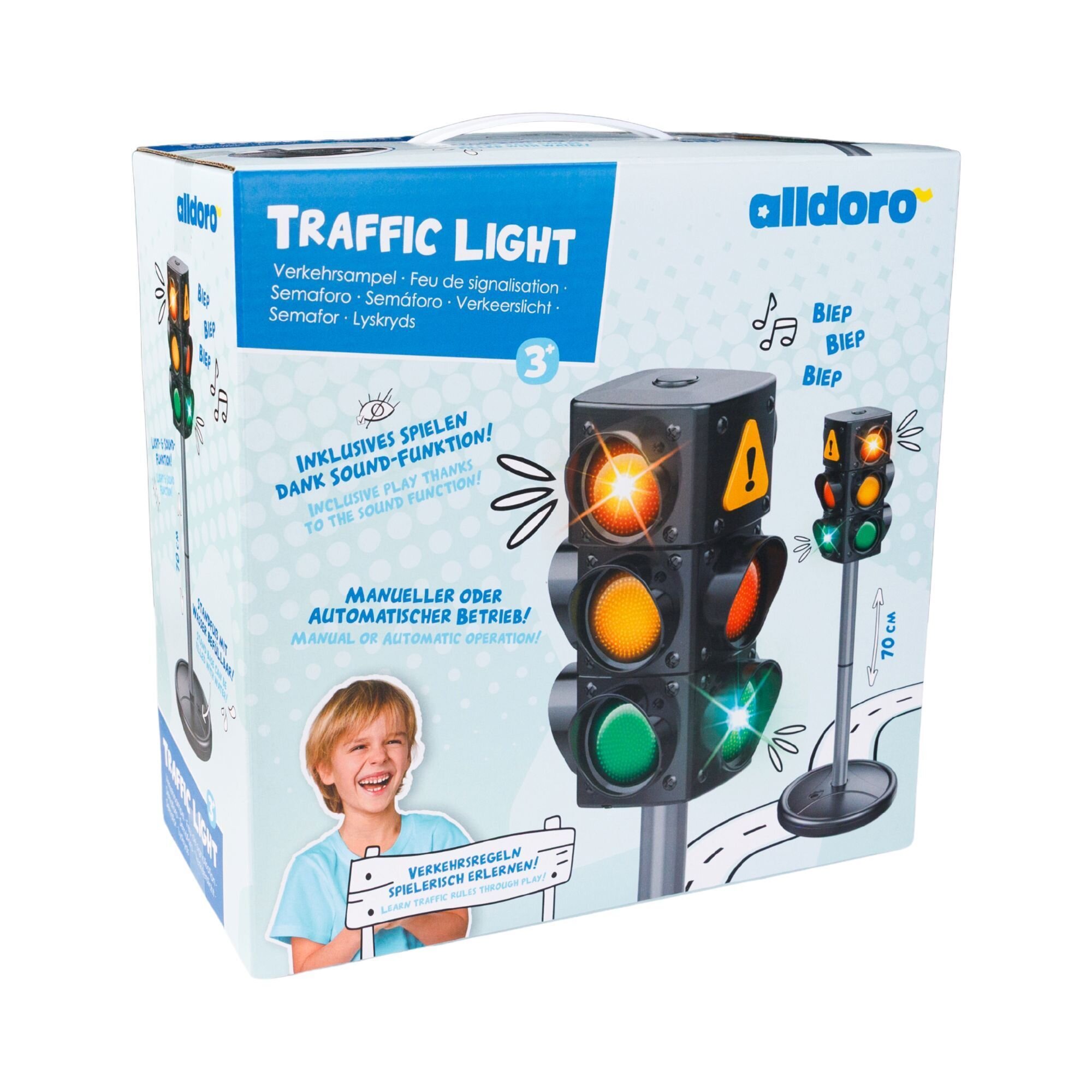Bateriově napájený semafor vysoký cca 70 cm se stabilní, širokou základnou, kterou lze naplnit vodou.
