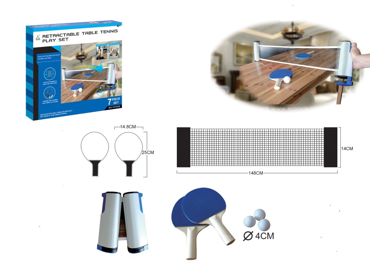 Sada síťky, pálek a míčku na stolní tenis. Síťka je stahovací a roztahovací. Max. délka 148 cm a výška 14 cm. Sada obsahuje 2 pálky a 3 míčky. číst celé