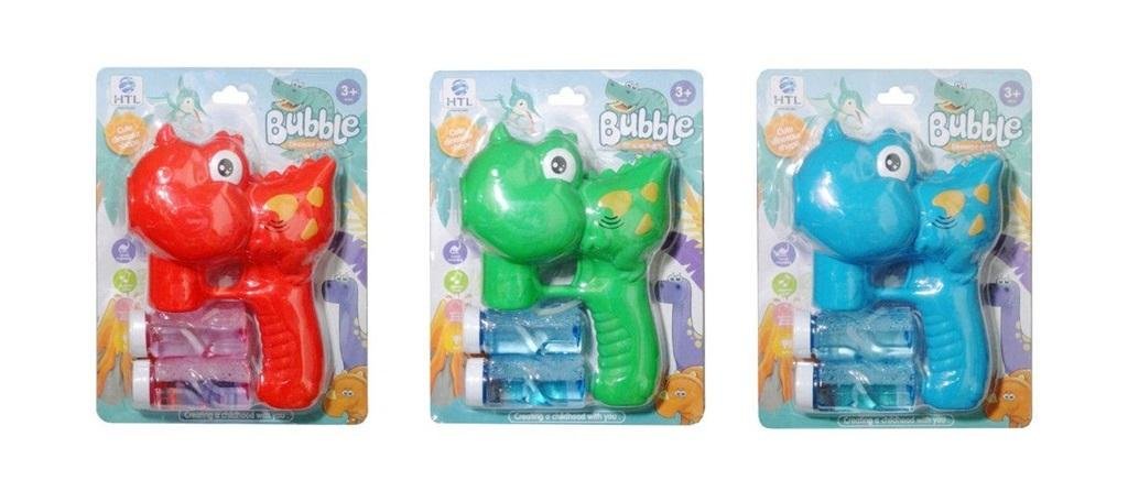 Plastikowy pistolet na bańki w kształcie dinozaura wraz z dołączonymi dwoma płynami do baniek. Zabawka pozwoli wytworzyć dzieciom duże ilości tak ulubionych przez nie baniek mydlanych. Produkt działa na baterie typu AA. Baterie nie załączone. Zabawka zapakowana w kartonową podkładkę z przezroczystym kloszem. Produkt przeznaczony dla dzieci od 3 lat.