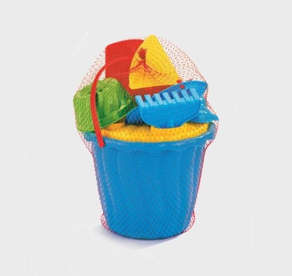 Zestaw do piasku zawiera: wiaderko, łopatkę, grabki, sitko, żaglówkę oraz 3 foremki. Mix kolorów, towar wysyłany losowo.