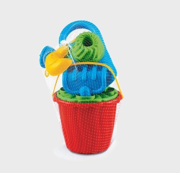 Zestaw zawiera: wiaderko z sitkiem, konewkę, łopatkę, grabki oraz 3 foremki.