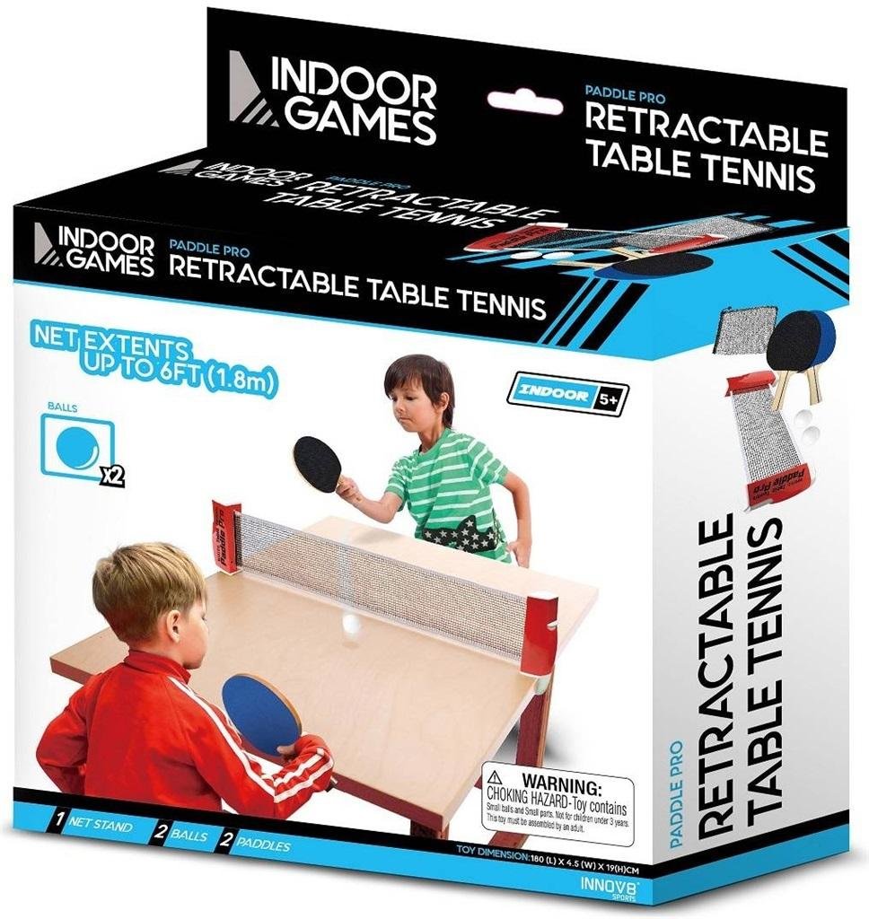 W zestawie: siatka 11 x 18 cm. z maksymalną szerokością do 180 cm, 2 piłeczki, 2 drewniane paletki 15 x 26 cm.