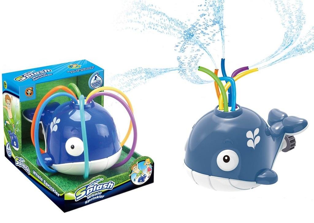 Wieloryb, który po dopięciu do niego węża z wodą, pryska wodą bawiące się dzieci. číst celé