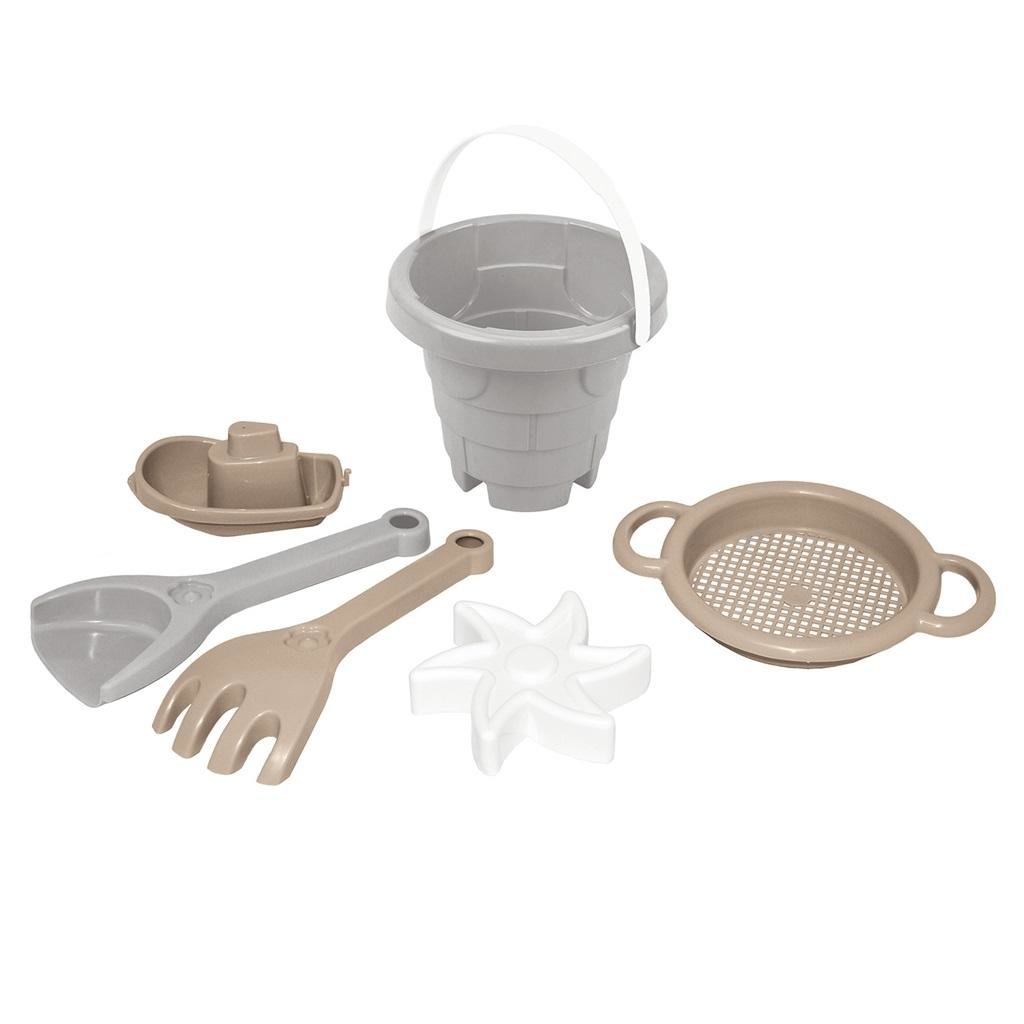 Zestaw do piasku Zamek z serii Toys in Trends w kolorach jasnego beżu, mlecznej szarości oraz bieli spodoba się wszystkim miłośnikom twórczej zabawy w piasku. W skład zestawu wchodzi 6 elementów: oryginalne wiaderko w kształcie zamku, grabki, łopatka, sitko, foremka w kształcie rozgwiazdy oraz stateczek. Zestawy letnie od marki Wader są odporne na warunki atmosferyczne takie jak deszcz czy słońce, zatem pozostawienie elementów zestawu w piaskownicy lub na balkonie nie grozi zniszczeniem ani odbarwieniem kolorów. Komplet do piasku daje dziecku możliwość kreatywnej zabawy, zarówno w towarzystwie rówieśników, jak i samodzielnie. Zestaw pobudza wyobraźnię najmłodszych