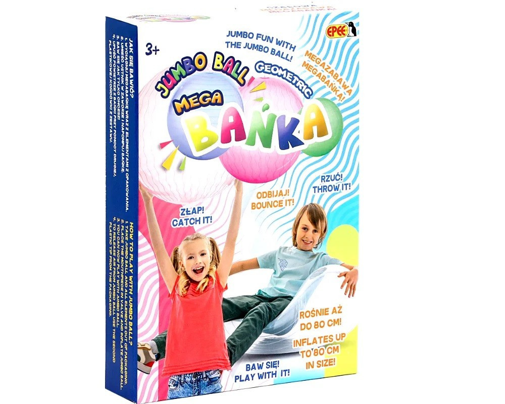 Nowość w linii MegaBańka w geometryczne wzory. Wygląda jak bańka, ale można się nią bawić jak piłką. Idealna do odbijania, podrzucania i grania. MegaBańka to niezwykła zabawka, która zachwyci zarówno małych, jak i dużych entuzjastów ruchu i zabawy na świeżym powietrzu. To idealna kombinacja radości i aktywności fizycznej, której celem jest zapewnienie niezapomnianych chwil zabawy.MegaBańka doskonale sprawdza się jako piłka, umożliwiając swobodne odbijanie, podrzucanie i wszelkiego rodzaju gry, które wymagają zręczności i precyzji. Jej duże rozmiary, sięgające nawet 80 cm średnicy, sprawiają, że MegaBańka jest nie tylko atrakcyjna wizualnie, ale także stanowi wyjątkowe wyzwanie dla graczy.Można się na niej wygodnie położyć, ciesząc się chwilą wypoczynku na świeżym powietrzu, dlatego tez MegaBańka to doskonały towarzysz pikników, plażowych przygód czy spontanicznych spotkań rodzinnych. MegaBańka to nie tylko zabawka to recepta na kreatywną i radosną rozrywkę, która sprawi, że każdy dzień na świeżym powietrzu stanie się wyjątkowy.W asortymencie: 4 kolory do wyboru: limonkowy, pomarańczowy, niebieski, różowy.