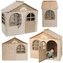 Domek posiada trzy okna z otwieranymi okiennicami oraz zasłonami, które umożliwiają regulację światła i wentylację. Dodatkowo, wyposażony jest w otwierane drzwi wejściowe, które zapewniają łatwy dostęp do wnętrza. To idealne miejsce do zabawy i spędzania czasu na świeżym powietrzu lub w przytulnym wnętrzu domu.