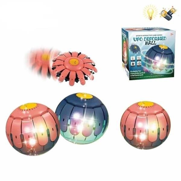 Dyskopiłka ze światłem LED. Po energicznym naciśnięciu piłka zmienia się w dysk, który rzucony w locie znów zmienia się w okrągłą piłkę. Podczas lotu miga kolorowa dioda LED. Produkt opakowany w kolorowy kartonik.