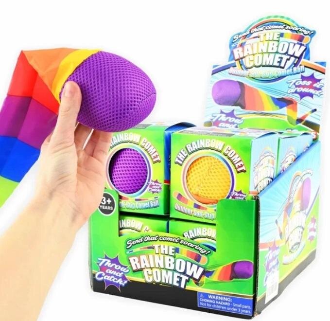 Super zabawa dla wszystkich wielbicieli dłuuuugich lotów :) Miękka, bawełniana piłka jest powleczona antypoślzgową siątką aby ułatwić rzucanie i łapanie piłki. Długi ogon w przepieknych barwach tęczy wykonany jest z bardzo lekkiego materiału. Długość piłki z ogonem to 72 cm. Piłka bez ogona to 9 x 9 cm.