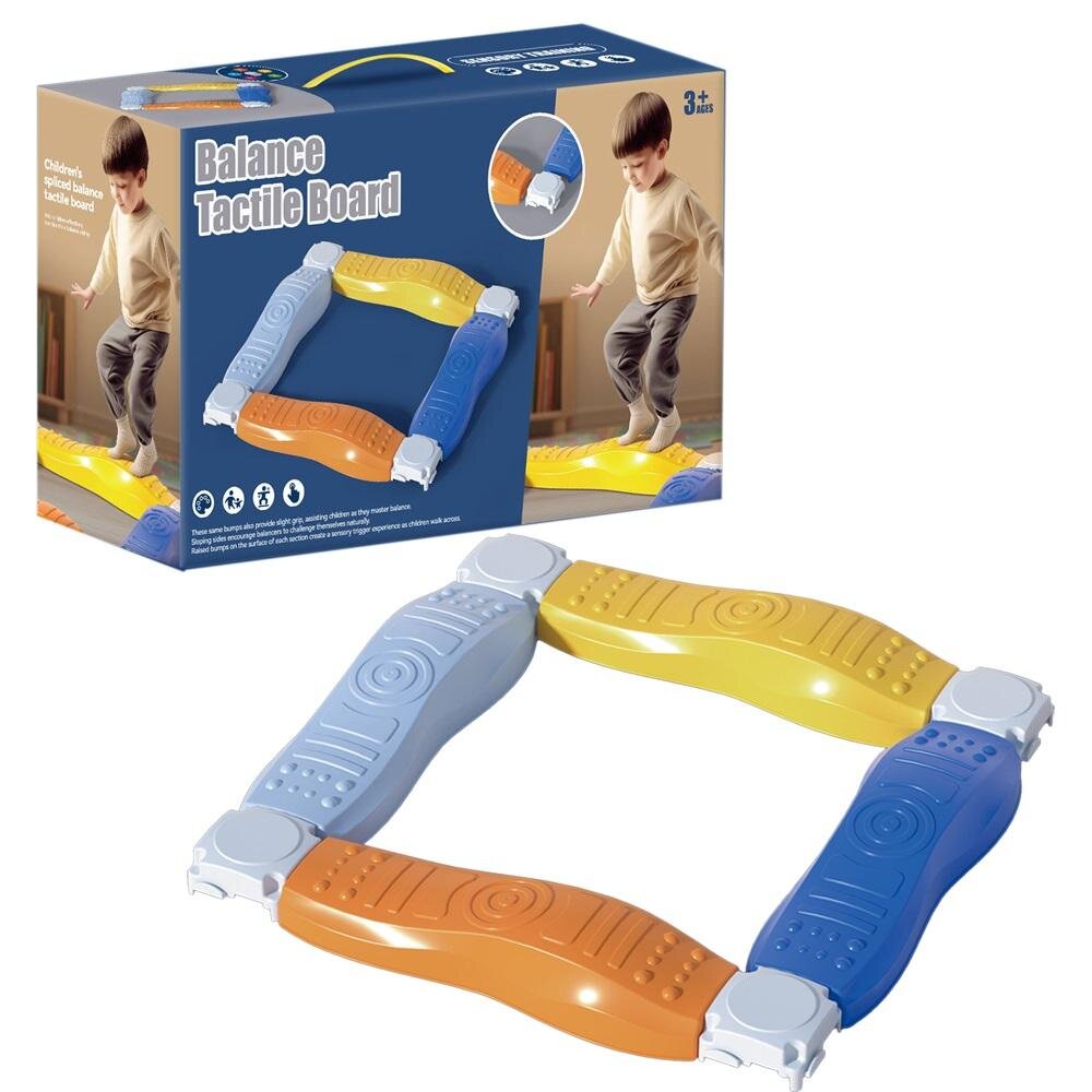 Zestaw składa się z czterech elementów w różnych kolorach i nieregularnym kształcie które służą do chodzenia po nich oraz z czterech łączników. Elastyczność zestawu pozwala zbudować ścieżkę prostą lub w kwadracie. Szybki montaż pozwala praktycznie natychmiast rozpocząć zabawę. Zestaw rozwija koordynację oraz zapewnia ciekawą rozrywkę. Wymiary zestawu po rozłożeniu w kwadracie 63 x 63 cm , wysokość: ok. 8 cm