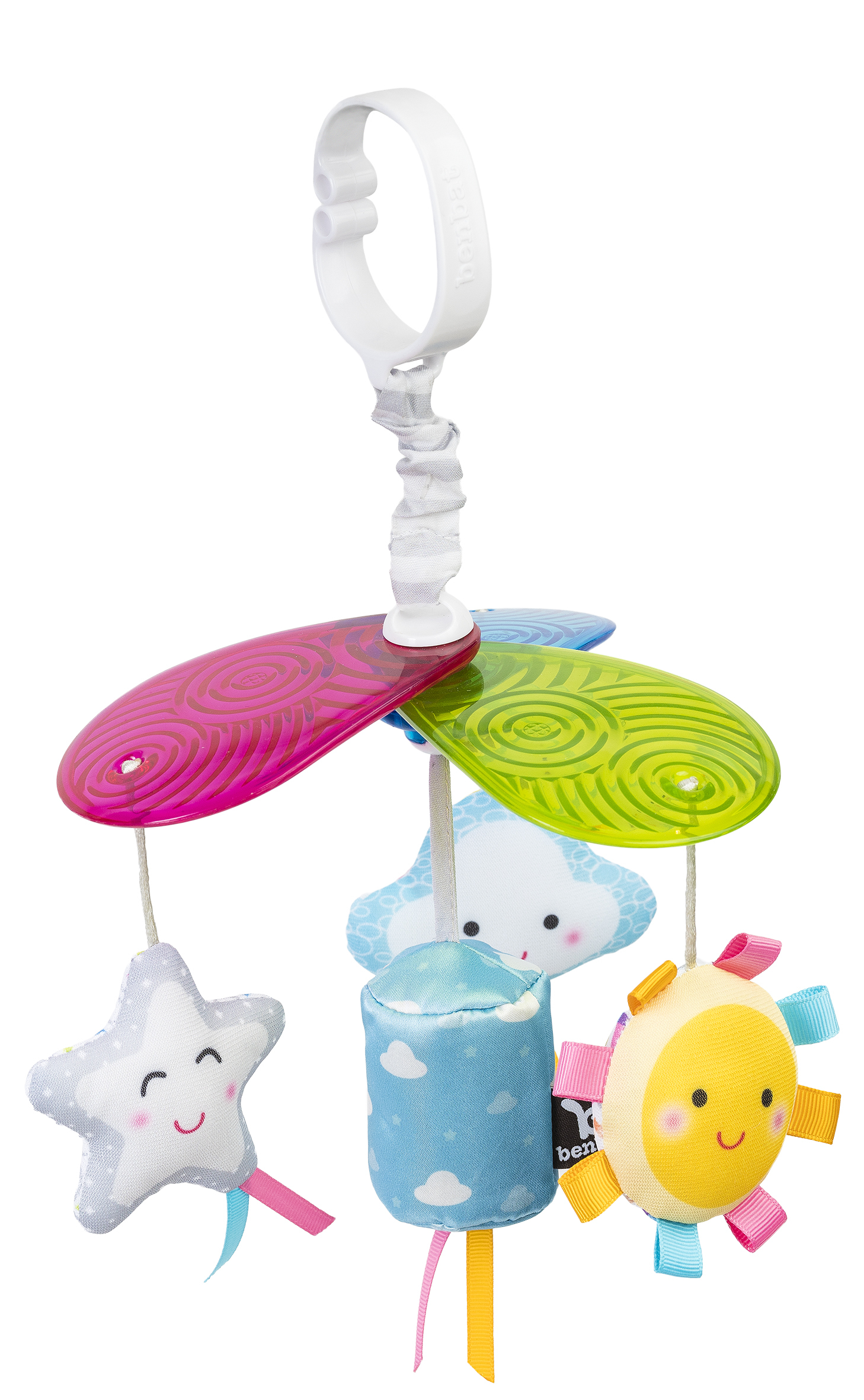 Skladná a snadno přenosná hračka, která se pomocí klipu jednoduše připevní na jakýkoliv kočárek. Hračky zavěšené na kolotoči pomáhají rozvíjet zrakové a hmatové schopnosti. Dohromady znázorňují oblohu. Děti nad sebou uvidí pohupující se mráček, sluníčko a měsíc. Uprostřed je umístěno chrastítko, které miminko láká k trénování úchopů.