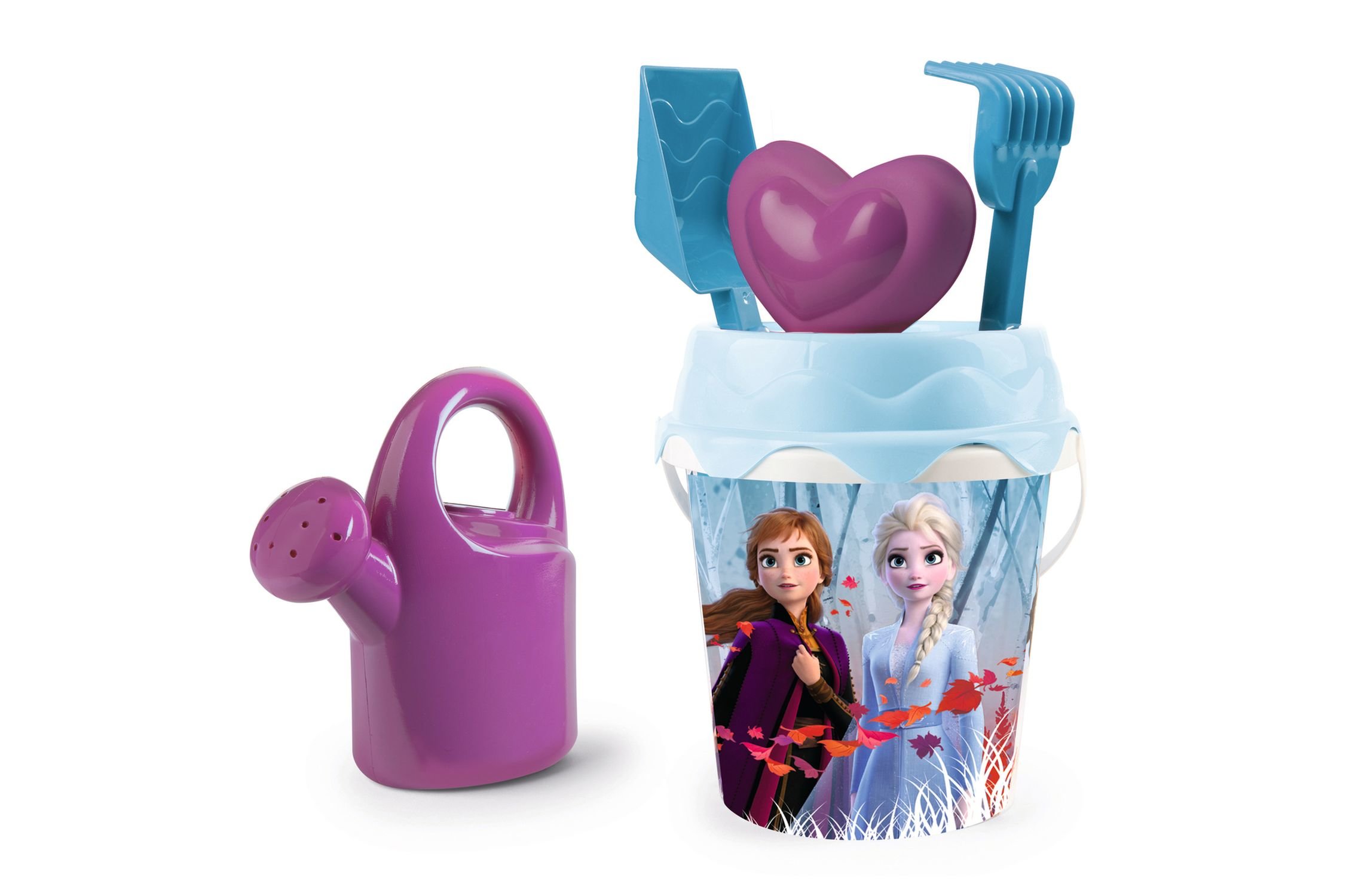 Set na písek s motivem licence Ledové království 2. Součástí je sítko, hrabičky, lopatka, formička na písek a konvička. Výška kyblíčku 17 cm.