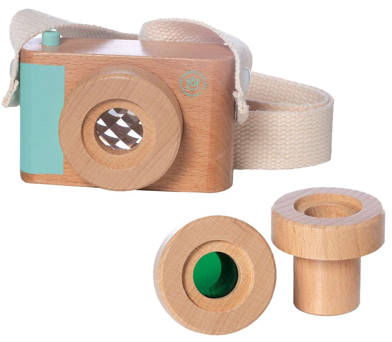 Czteroczęściowy zestaw zawiera drewniany korpus aparatu, pasek na szyję i trzy wymienne soczewki: przezroczystą, zieloną i z kalejdoskopem. Pasek z tkaniny można odpinać, dzięki czemu maluchy z łatwością uchwycą każdy obraz. Zabawka wspiera kreatywność, naukę odgrywania ról, a także rozwój wizualny, poznawczy i społeczno -emocjonalny.
