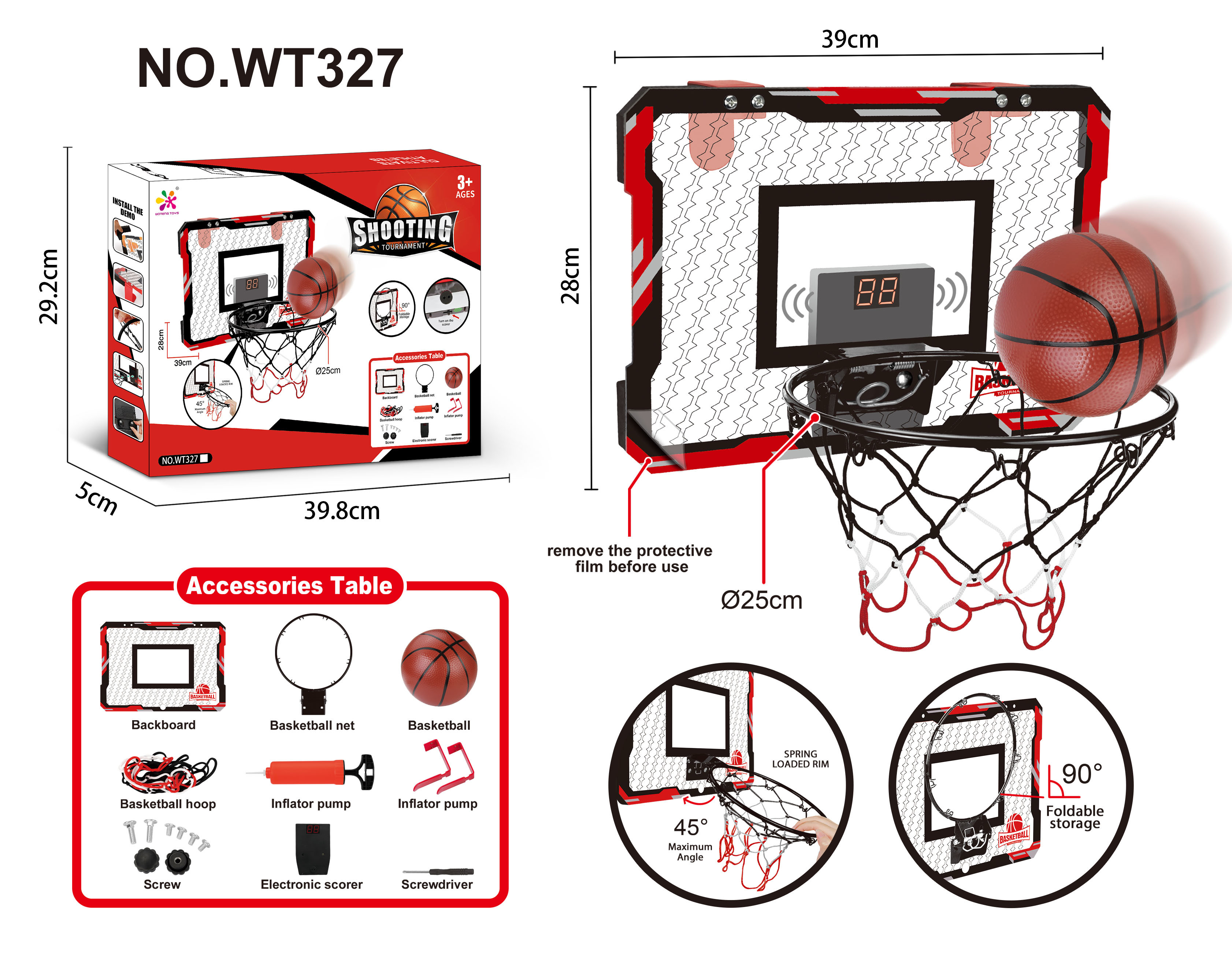 Basketbalový koš s počítadlem a míčem. Rozměry desky 39x28 cm. Součástí koš, síť, míč, pumpa. 3xAAA baterie součástí.