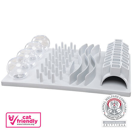 Toto interaktivní hřiště je navrženo expertkou na chování koček Helenou Dbalý, aby podporovalo aktivitu a duševní stimulaci zvířat od tří měsíců věku. Jeho protiskluzové gumové nožky zaručují bezpečné používání na jakémkoliv povrchu. Ať už chcete vaši kočku zaměstnat nebo zpestřit její stravování suchým krmivem, tento produkt je ideálním řešením.