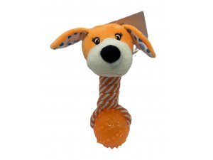 Bavlněné přetahovadlo pro psy s plyšovým zvířátkem, zakončené míčkem z termoplastické gumy.